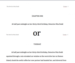 My distaste for chapters is well-known, but I always comply. This time I’m thinking maybe not. Nita takes place from Tuesday very early morning to Sunday morning. I was thinking about going with Tuesday, Wednesday, Thursday, Friday, Saturday as headings to break up the book because that would help keep people oriented to the passage of time, especially since it’s a timelock plot (Nick has to become the Devil at midnight on April 2). One problem, “Tuesday” would be 52,000 words. (It’s a long book.). Sunday will be about 2000, so it’ll even up a little, but still, that’s a long first section, over 200 pages. What do you think?