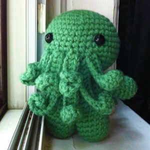 And then when I thought about it, it was obvious: Most of Nita lies dreaming, too, all her power trapped asleep in her subconscious. (The Girls are geniuses.) And because her mother suppressed that power, made her repress it, she’d see it subconsciously as a monster within her. So I went back to the neck roll and wondered where she’d gotten it, although the story’s set on Demon Island, so probably anywhere. But I wanted it to be special, so I thought maybe her great-grandmother had made it for her. Her mother is nuts (for good reason, it turns out) and her grandmother’s nuts (for no good reason, sometimes you’re just born a selfish nutjob), but her great-grandmother is pretty solid, considering she’s half-demon. So Great-Grandma Keres made her the Cthulhu neck roll, which little Nita probably carried around like a doll. And of course I’m going to have to make one now. I think I’ll start with this pattern, and evil it up some with hooded eyes. (Wait, wait, hooded eyes? No wonder she falls for Nick. My God, the Girls are GENIUSES). So it should be cuddly but not cute. Much like Nita.