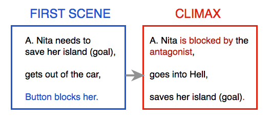 • And a big key is parallelism. At the end of the first scene, Nita tells Button to leave and get a new partner, and Button surprises her by saying no, beginning the partnership. At the climax, Nita says good-bye to Nick,, who’s now the Devil, on the assumption that she’ll be leaving Hell by herself, and Nick surprises her by saying no, foreshadowing a new partnership.