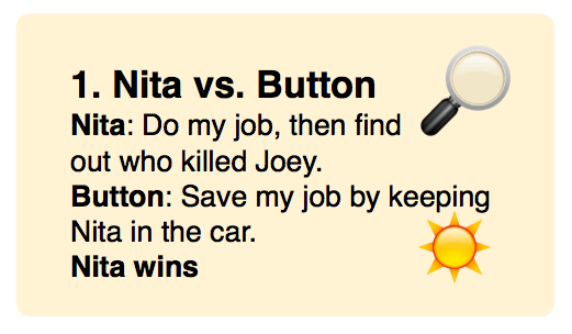 • What climax the scene is heading for (Nita wins and gets out of the car, Button following)