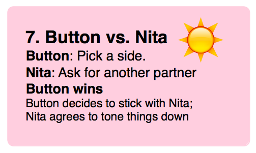 • What Nita’s focusing on throughout the scene, her goal (setting Button free to save her career).