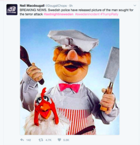 This would be just another alternate fact in the increasingly bizarro world America is now inhabiting were it not for Twitter, which immediately adopted the hashtag #lastnightinSweden. The tweets there will warm your heart (especially if you like Ikea and the Swedish Chef).