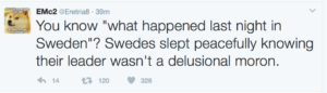 Evidently Trump cited the horrific events that happened “last night in Sweden” during his love fest campaign rally for the 2020 election.
