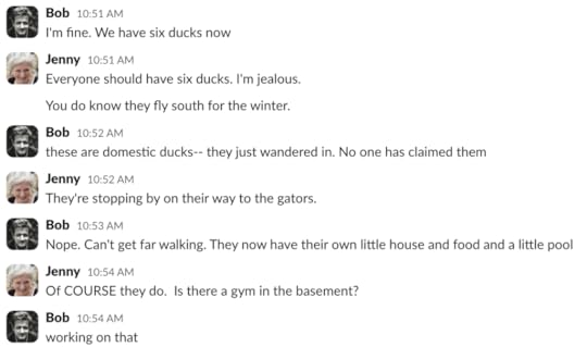It’s been a bad month for me and I haven’t gotten much done. Bob is being very patient–well, he’s building a basement gym for ducks so he’s distracted–so I sent him the first chapter of our next book, a real spitballing first draft, aka bad. He sent it back with two more chapters so we are now three chapters into Stealing Nadine, and that’s all I’ve read this week. It’s rough but it’s a good start with action (because Bob rewrote it, mine was just a bunch of conversations which surprises nobody) but hey, it’s a start.