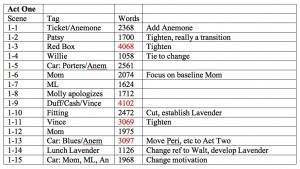 The key is to look at where I got wordy, and I have helpfully highlighted those counts in red: Scenes 1-3, 1-9, 1-11, 1-13.