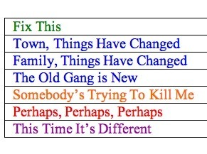 The other sequences are "The Town, Things Have Changed I" (1-4 to 1-5), "Family, Things Have Changed I" (1-6 to 1-8), "The Old Gang Is New" (1-9 to 1-11), "Somebody's Trying To Kill Me I" (1-12 to 1-13), "Family, Things Have Changed II (1-14 to 1-15), "Fix This II (1-16 to 1-19), "Perhaps, Perhaps, Perhaps I" (1-20 to 1-22, the romance plot; I like Pink Martini, sue me), and "This Time It's Different I" ( 1-23 to 1-24) which always ends with the turning point scene. See? Clear as mud, right?