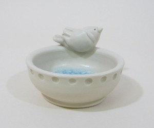 Cedar Pocket on Etsy. Melissa's chunky, matte white birds on thick ceramic bowls cheer me up every time (that's a blue recycled glass puddle in the bottom there).