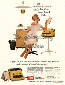 I'm still on the road, but I got to see Mollie today, and we started talking about covers for the non-fiction e-books. We've picked a cover for the short story collection that can be adapted for other short story collections so that there's a series look to them, but now we have to do the same thing for the planned "She Wrote" e-books (yes, there will be a Print on Demand option). Mollie found some madly fabulous retro secretary ads that were beautiful, but they were also too detailed for a book cover and, I thought, too narrative. If you saw the image below on a cover, wouldn't you think it was a story, not a non-fiction writing book?