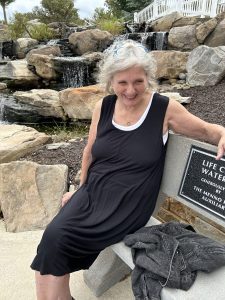 Because I haven’t had a new head shot for about fifteen years, maybe twenty, today I dragged Pat Gaffney out to the little fake waterfall beside our favorite grill and said, “Headshots, I need them.” And she was, as always, a peach, and took a million of them.