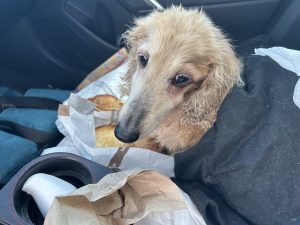First I had a giant POD delivered and it took out part of my fence. Then Veronica got a bath and a visit to the vet’s which included shots and ear cleaning, so we’re now sitting in McD’s parking lot while she snarfs down TWO plain apology hamburgers. It seemed like the least I could do.