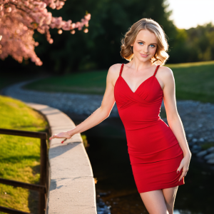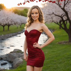 (full body) photograph of a young woman[Joanna Krupa:Summer Glau:0.6] standing under a blossoming cherry tree, stream flowing in background, athletic build, fit, slender waist, narrow hips, platinum blonde hair, french-twist hairstyle, big blue eyes, smiling, (wearing a short (red:1.5) beaded cocktail dress with black details), rim lighting, sunset, twilight, soft focus, dof (low key)