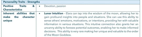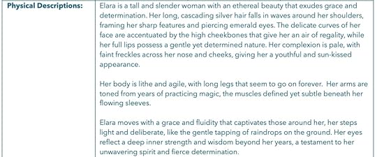Here are these sections for my character Elara. She is still a work in progress, but is shaping up nicely. If you read through this, I hope you can get a sense of her story and how her interactions with the other characters would change her in a satisfying manner. I hope to publish Elara’s tale before the end of the year.