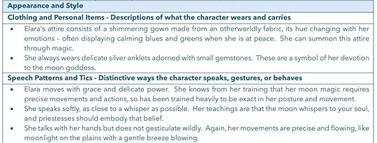 Looking at this part of the template for Elara gives some additional insight into how I might incorporate these details into her story: