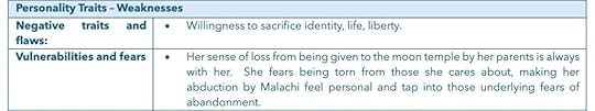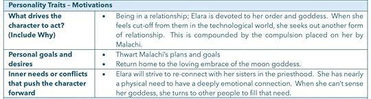 You can already see what is going to drive Elara’s action as she faces obstacles in her journey. Malachi (the antagonist of the tale) is the reason she has been cut off from her sisterhood. Since I’m early in the writing of her story, I can’t share how these traits, motivations, and goals have translated to the page, but I know they will