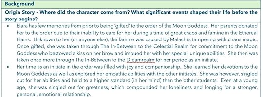 The background information you choose to put into the template may be sparse or very detailed. Elara’s background spans nearly half a page (too much to post here), but this is an excerpt of it: