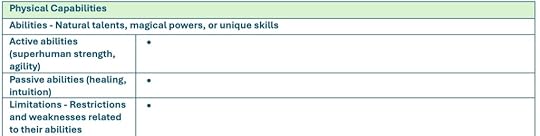 I chose not to cover every section of the physical descriptions. I did not touch on any physical abilities they may have, or specific physical vulnerabilities. Characters may have active abilities they can use, or passive abilities that just are. They also have limits to those abilities. Every Superman needs a little kryptonite to keep them on their toes.