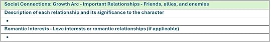 Relationships and romance could be an important part of the character’s growth arc. Detailing these out early in your planning could drive dialog, actions, and emotional outcomes throughout the story.