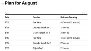 Day of Week (or date)Exercise / GoalAchievementMondayCharacter Sketch (Exercise 1) TuesdayLocation Sketch (Exercise 3) WednesdayFree write (15 minutes) ThursdayCharacter Sketch (Exercise 2) FridayLocation Sketch (Exercise 4) SaturdayRest Day (do something fun!) SundayFree write (15 minutes) MondayCharacter Sketch (Exercise 2) TuesdayConflict Sketch (Exercise 5) WednesdayFree write (15 minutes) ThursdayPlot Outline (Exercise 6) FridayShort story (Exercise 7) SaturdayShort story (Exercise 7) SundayRest Day (do something fun!)The workbook available for free to subscribers includes this as a blank template you can tailor to your own needs. If you have other exercises you enjoy, include them (and share them in the comments). Maybe you like to write a haiku on a regular basis. Add it as an exercise to your schedule.