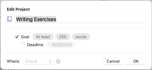 While trying out Ulysses, I became intrigued with its ability to set goals on a per-project basis. This felt like a prime opportunity to move my daily writing exercises from MS Word (or even plain text) into something a little more structured. I’m happy to say, my set up works, but there are some opportunities for improvement in the tool itself.