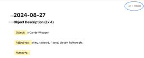 The first exercises I did was a free write for fifteen minutes. It was 600+ words long, which was much too long for most of the exercises. 250 words seems like a good setting for now.