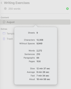 I can now cut and paste the needed parts of the template for any given exercise into the sheet for that day and start typing. A nice feature of Ulysses is how it shows statistics on the sheet you’re working on. For this exercise, I can easily see its 211 words, including titles and the template prompts: