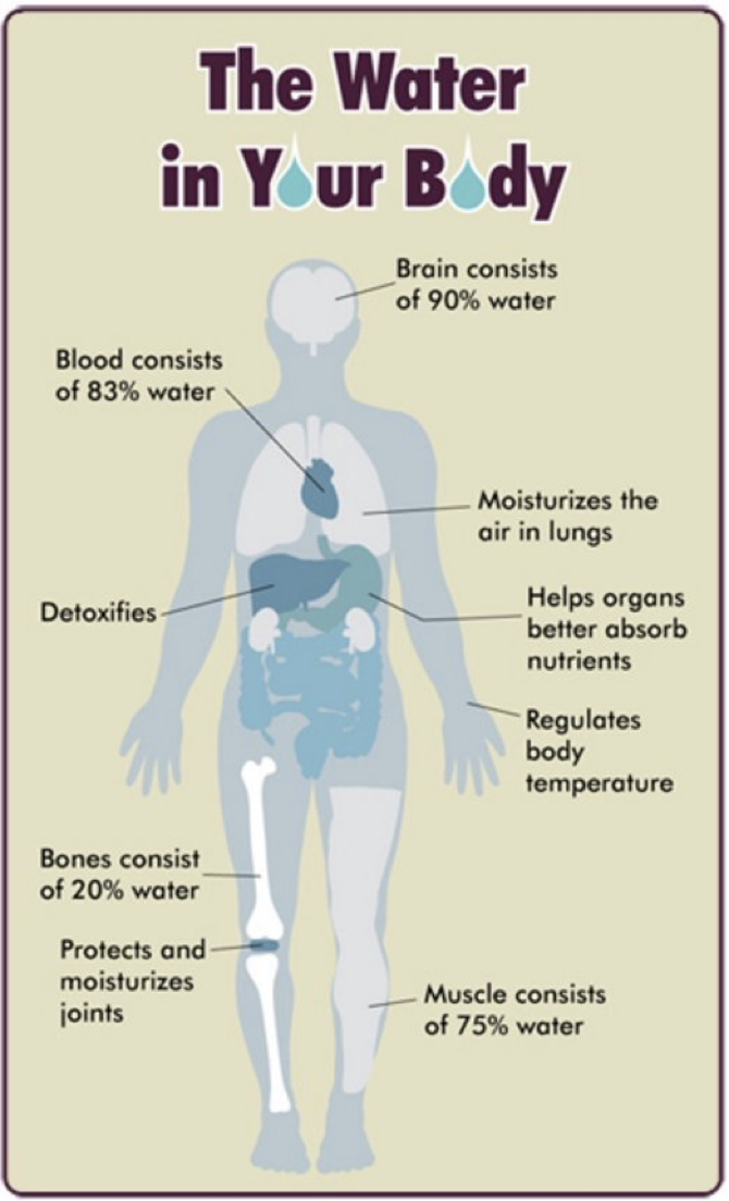 Over three-quarters of your body is composed of fluid. Perspiration is not the only way you lose water. We actually lose more water just by breathing. And you can’t stop that loss. We lose around 2 to 4 cups of water a day by exhaling (16 cups equal one gallon). We lose about 2 cups via perspiration. We lose one half to a full cup just from the soles of our feet. We lose six cups via urination. You lose a more than half a gallon of water a day just existing; more depending on the weather and your activity level.