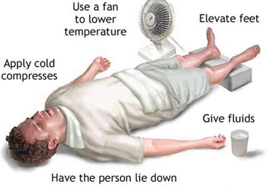 Heat Stroke Treatment: Fan air over the victim while wetting skin with water. Apply ice packs to the armpits, groin, neck, and back. These areas have more blood vessels on average, so cooling them can reduce the body temperature. Immerse the patient in a shower or tub of cool water. Or a stream or lake. Be sure to wet the victim’s head.