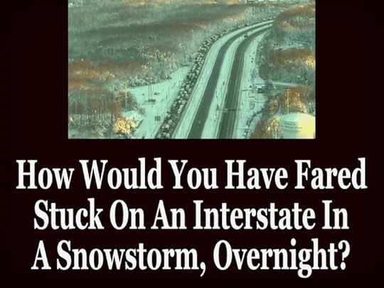 How many of those trapped drivers took to the road unprepared for an emergency? Most. How many have a good pair of walking boots in their vehicles? Few. How many have blankets and extra water and food? Few. How many failed to check the weather?