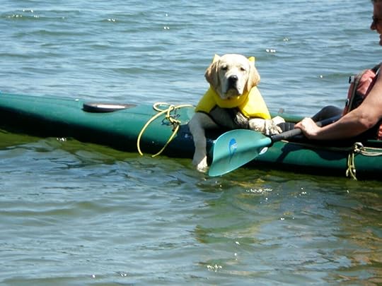 I didn’t know how to share what I felt with people, not even my wife or friends. I’d dealt with my feelings all my adult life by writing to escape. Gus didn’t care under the desk–but he got me out on my kayak, promptly capsizing it the first time we launched in Puget Sound, and made me laugh. He got me back to the water and our son, Corey, was in the water. We’d go to the beach and I throw him a ball and he’d swam after it and one time pushed it so far out that I had to go into the freezing water and get him back. And I felt Corey all around me in the water and I began to cry and my salty tears fell into the salt of the ocean and Gus heard me and turned around and I carried him to the beach and we watched the red ball float out till it was a speck under the setting sun and Gus and I sat on a pile of driftwood while I cried so hard and he leaned into me and licked the tears from my face. We let the ball go because it was Corey and I wondered if Gus pushed it out there so I could watch it float away and know that everything we love does float away eventually, but we can keep it all around us once we express the pain and keep the love. Cool Gus gave me that. Then I said–let’s go home, Gus.