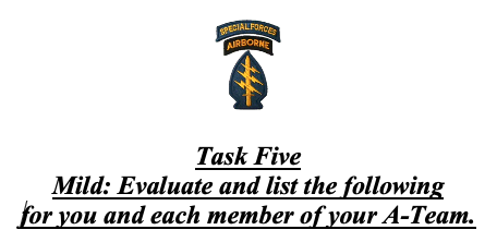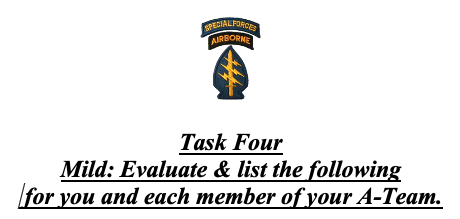 Mild: Evaluate and list the following for you and each member of your A-Team.