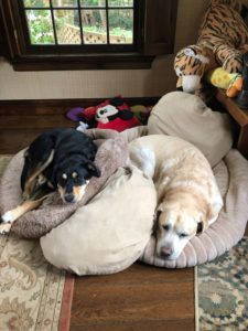 A happy picture, although they are not adhering to social distancing, of Scout and Cool Gus in my office with Tigger ready to pounce in Gus’ defence.