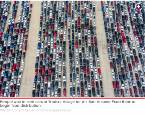 The image is supposed to be of 10,000 people lined up, waiting for a food bank to open in San Antonio. I’ve seen similar lines of cars all around the country waiting on food banks.