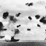 The Japanese fighters protecting their fleet made short work of the unaccompanied American torpedo planes as they flew straight in at low level to launch their torpedoes, making them easy targets. Nevertheless, the Navy pilots did it. All 15 planes of VT-8 were shot down and only one man survived, Ensign Gay. VT-6 lost 10 of 14 planes and VT-3 lost 10 of 12 planes.