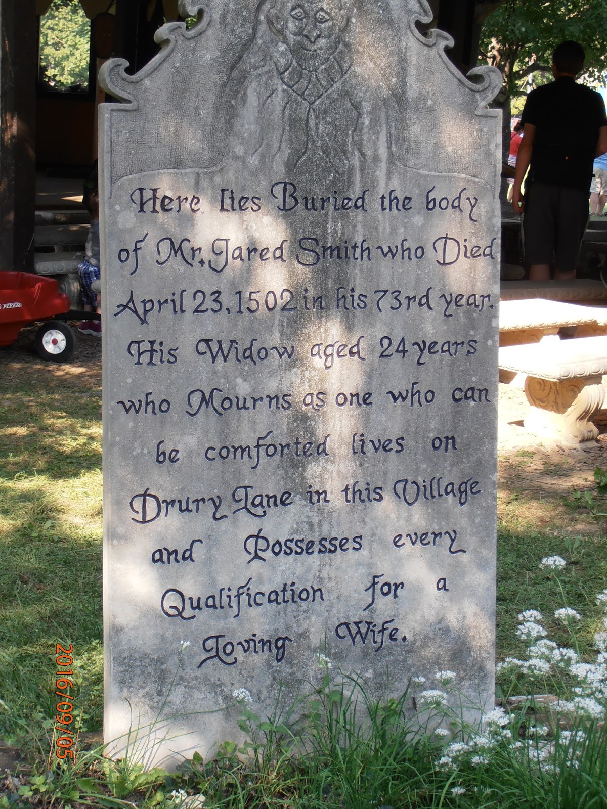 Epitaph-cum-Classified Ad? "Here Lies Buried the body of Mr. Jared Smith who Died April 23, 1502 in his 73rd year. His widow aged 23 years who Mourns as one who can be comforted lives on Drury Lane in this Village and possesses every Qualification for a Loving Wife." Finally, arriving with some pomp at the jousting event, which usually ends the day for us, was good ol' Queen Bess, Queen Elizabeth, that is, in beautiful array.
