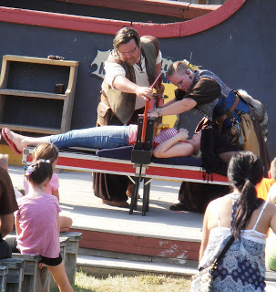 The Entertainment: Audience participation was de rigueur. (When they ask for volunteers, this is when the wise judiciously avoid eye contact at all costs.) Some of the entertainment was not included with admission, which was about $22 per head. (We went on the buy one/get one admission weekend!)Magic ShowsAxe-throwing, Archery. George and the Dragon (Perfect dress-up and play for the kiddies)Stocks (usually empty)A Castle with Dungeon "Fool Hearty"Jousting Knife-Throwing Comedy Show (the best act we saw)\A medieval cemetery (small but effective)A MazeHorse or Pony RidesCamel ride (A smaller camel, but perhaps it's safer that way)Archery "Drench the Wench"Merry-Go-Round "Test of Strength"Other kiddie ridesLive MusicAnd More