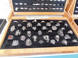 The Sign says: Large Stainless Steel Rings $50.00 - $65.00. Wares for sale: Wood and clay mugs, potteryStaffs, anklets, shieldsViking HelmetsGarlands, sashes, hair bandsEssential oils and incense, candlesWalking sticks, wood carvingsrings, puzzle rings, necklaces, key chain charmsbicornes and tricornes fabric pursesknives, axes, old-fashioned pistolsfox tails, leather whips, animal peltsswords and scabbards, some hand-forgedgemstone wind-chimeschain-mailleather boots, 1/2 boots, moccasinsmasks, magic wandsstained glass hangingsdragon eggs (crystals)small stone sculpturesrope sandals, flags, archery quiversmedieval outfits, children's outfitsladies' corsets, bodices, etc. ("Damsel in This Dress")Elf earsYe Olde Quilt Shoppe pictures, artwork"Souvenirs, Gifts and Wares"Wood ShoppeBook Shoppe