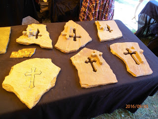 The husband picture didn't make it, but this lady is the wife in an act that could be called a Medieval-style battle of the sexes. Included some derring-do and swordplay. Fun! The shops ran the gamut from neat leather goods to occult weird stuff. There was a wonderful quilt shop and it even had a couple of Christian themed quilts. Animal pelts galore, medieval clothing, jewelry, crystals, pottery, weaving, and more.