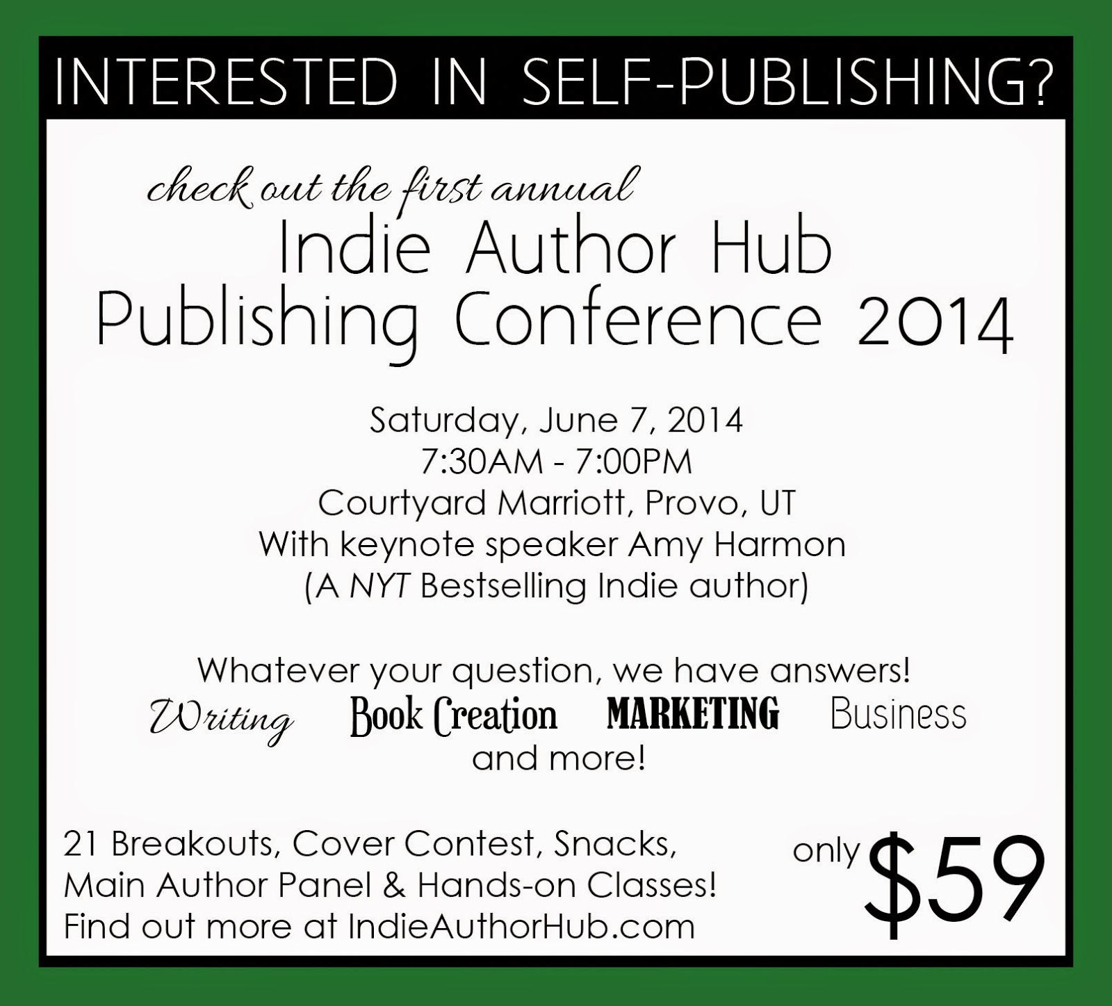 Indie Author Hub is sponsoring a super awesome, super huge, Indie author conference this June! I'll be on a panel or two and am in charge of a book cover contest we're holding in conjunction with the conference.