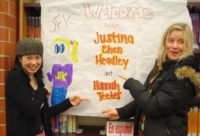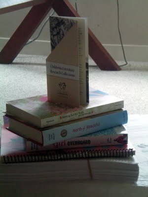 So I sent one of my early drafts of GIRL OVERBOARD, the notes I took while studying up on snowboarding, and some signed first editions and galleys.