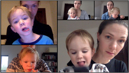 Spouses could agree to take turns in attending to children during the online group meeting. One spouse would help with the kids this week, if they need something during the meeting. Then the other spouse could help next week. Both spouse can participate in the meeting, but one would be “on call” when their children need someone.