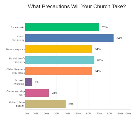 Most churches anticipate using social distancing in their seating and common areas or what Life.Church calls a Touchless Service. Other precautions mentioned in a recent survey conducted by this blog include requiring congregants to wear face masks, not offering nursery care, encouraging older members to stay home, and waiting to reopen their children’s ministries. A handful is planning drive-in or outdoor worship services.