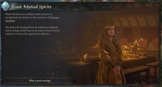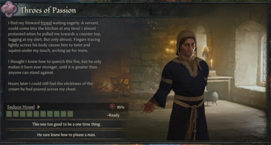 At night they feasted, more toasts, more petitions, more chatter, before the households and retainers of the lords and ladies stumbled down to their tents on the tourney field. Lady Mathilde and Arthwr would entertain their vassals and their children. Hywel would bemoan only having daughters, Rhodri would speak of all manner of esoteric knowledge of the human body that perhaps wasn’t appropriate just after dinner, Mordred would drunkenly profess his love for his comrade-in-arms–he’d taken quite enthusiastically to the bottle lately… Alberto watched the proceedings with his usual intensity.