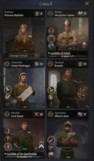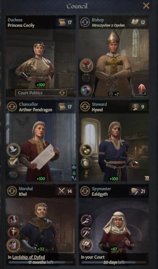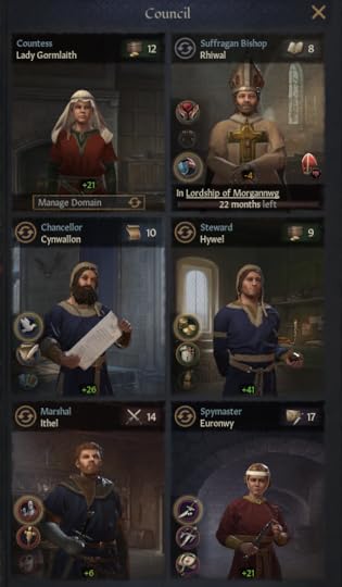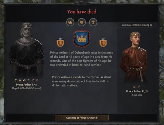 Soldiered on indeed. The difficulties of succession came from his younger brothers, sword-swinging Mordred and the odd little idiot Hywel. By law, Mordred inherited Morgannwg, Hywel: Gaerfyrddin, which deprived Caerllion of income and levies.