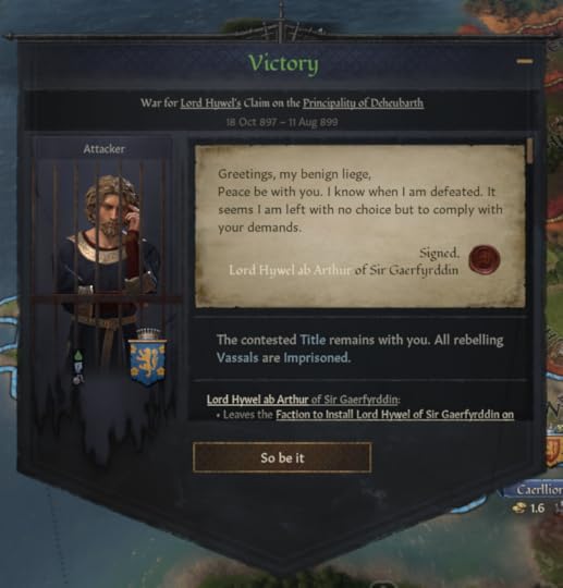 Alberto grinned at the idea, but Arthwr shook his head. “We will not be murdering my son’s betrothed. The men of Deheubarth are men of honour. We will honour the marriage, as we will honour the alliance, as we honour the ownership of Eryri.”