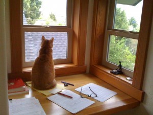 In this photo of my writing space, my cat apparently decided I would have to do without some of my notes—at least until he decided to move to another window.
