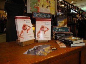 I caught a firsthand glimpse of the mainstreaming of the EBM on my recent book tour, when Northshire Bookstore in Manchester Center, Vermont, printed up copies of Forgetting English rather than ordering the books and having them shipped. A couple of readers got to see their books being printed, which was fun — and the quality was amazing. The book cover was matte rather than glossy, and the pages were thick, the print crisp, and the binding strong. And I got a kick out of seeing a new and different version of Forgetting English, made to order.