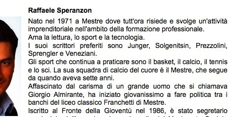 Both these public officials, Raffaele Speranzon (Assessore for Culture of Venice's provincial administration) and Elena Donazzan (Assessore for Education of Veneto's regional administration) are former members of the Movimento Sociale Italiano, the neo-fascist party that was active in Italy from 1946 to 1993. Now they are both members of Berlusconi's party, the Popolo della Libertà.