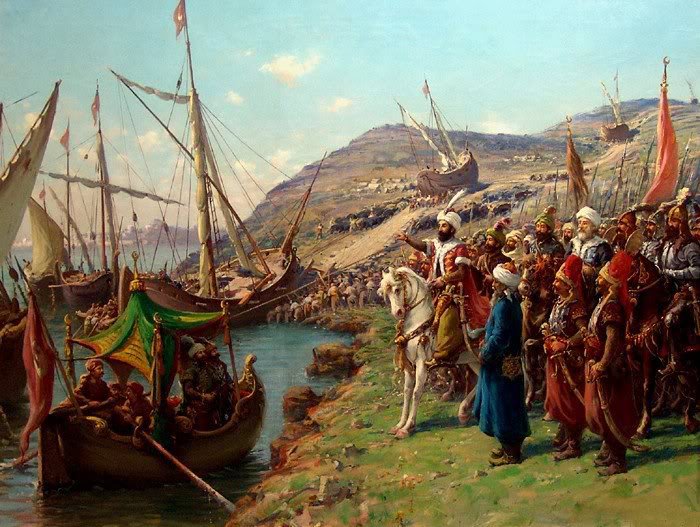 Gambaran pelukis ketika Sultan Muhamad al Fateh melayarkan kapal perang di atas daratan kertika menakluk Kota Konstantinopel.