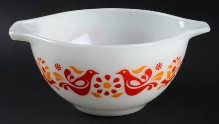 I’ve often wondered what happened to her collection of bowls. I believe they were a wedding present. Does the person who got them ever know this? And what about the bowls I’ve seen in second-hand shops? Who owned and loved them? And how did they come to be abandoned? Did someone die? Or did they just stop loving their bowls? I’ve bought others since then. They started showing up and I found them cheaper by the way than the initial set I bought, but I found many of them at the fabulous Ros0e Bowl Flea Market. If you live in LA and you’ve never been, do yourself a favor and go. It’s on the second Sunday of every month. I’ve come to discover this is where Pyrex bowls go to die. Er, I mean, where they go looking for a second chance at culinary love. I found a wonderful bowl there years ago called the Friendship pattern. Others call it Cinderella but Pyrex calls it Friendship. My bowl was white with red and yellow pictures of birds and a floral design. Very 50s.