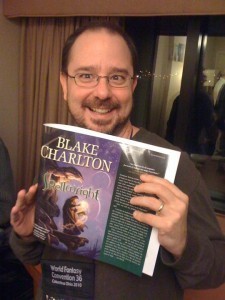 Friday kicked off with a reading by my roommate Matt Kressel. Matt did a great job reading a creepy, epic piece that I could call a mash of a Peter S. Beagle fable with Nightmare on Elm Street. It'll publish in Beneath Ceaseless Skies in December. After I sat down with Brent Bowen and had a whole lot of fun recording an interview for Adventures in Sci-Fi Publishing. We're not sure when that podcast will run, likely when the pre-sales for Spellbound open (more on that in a second). Thereafter I joined Peter V. Brett, Deanna Hoke, and Myke Cole for dinner and met artist Lauren Cannon, who designed a kick-ass bookplate for Pete. Depending on the state of Blake's Med Student Debt, I'm thinking about commissioning one such for the Spellwright Trilogy. Afterward we crashed the "group signing event." Sam Sykes and I goofed off while the lines stacked up behind Guy Gavriel Kay, Gene Wolf, and the other rockstars. Then real function of the con got started in the bar. The gurus of the internet represented themselves strongly in the presence of John DeNardo, Daniel Goodman, John Anelio, and Pactrick Hester. Staying up late is easy to do with so much great company…and it's double extra special easy to stay up late when one's mind is still on Pacific time. My head didn't hit a pillow until 3:30am.